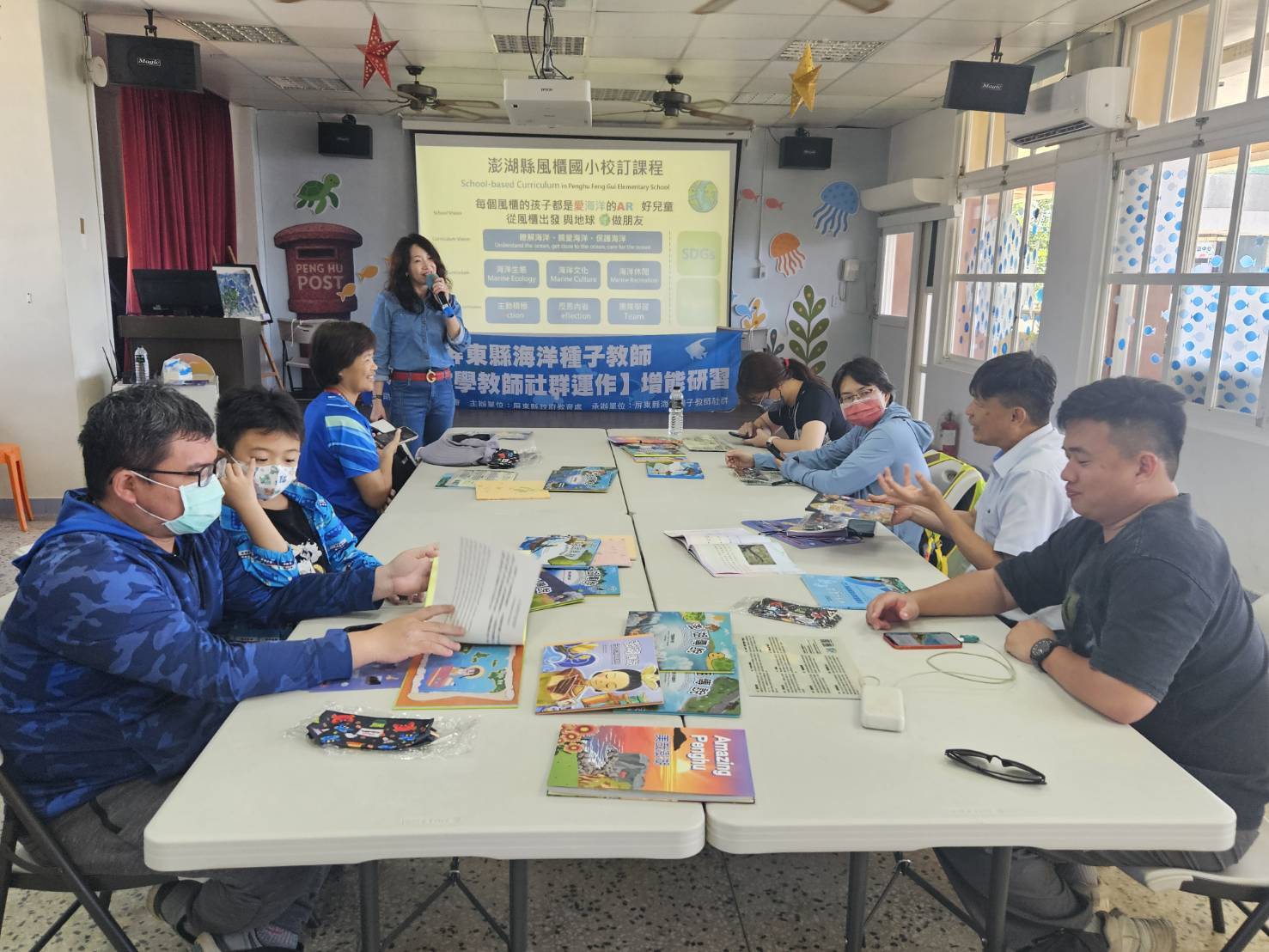 在熱情的相見歡之後,由校長親自向參訪夥伴介紹澎湖縣推動海洋教育的創新作法,包括「海洋保育教材」、「在地海洋文化雙語繪本」等具地方特色的教學資源。